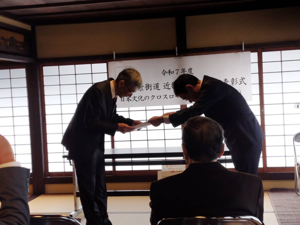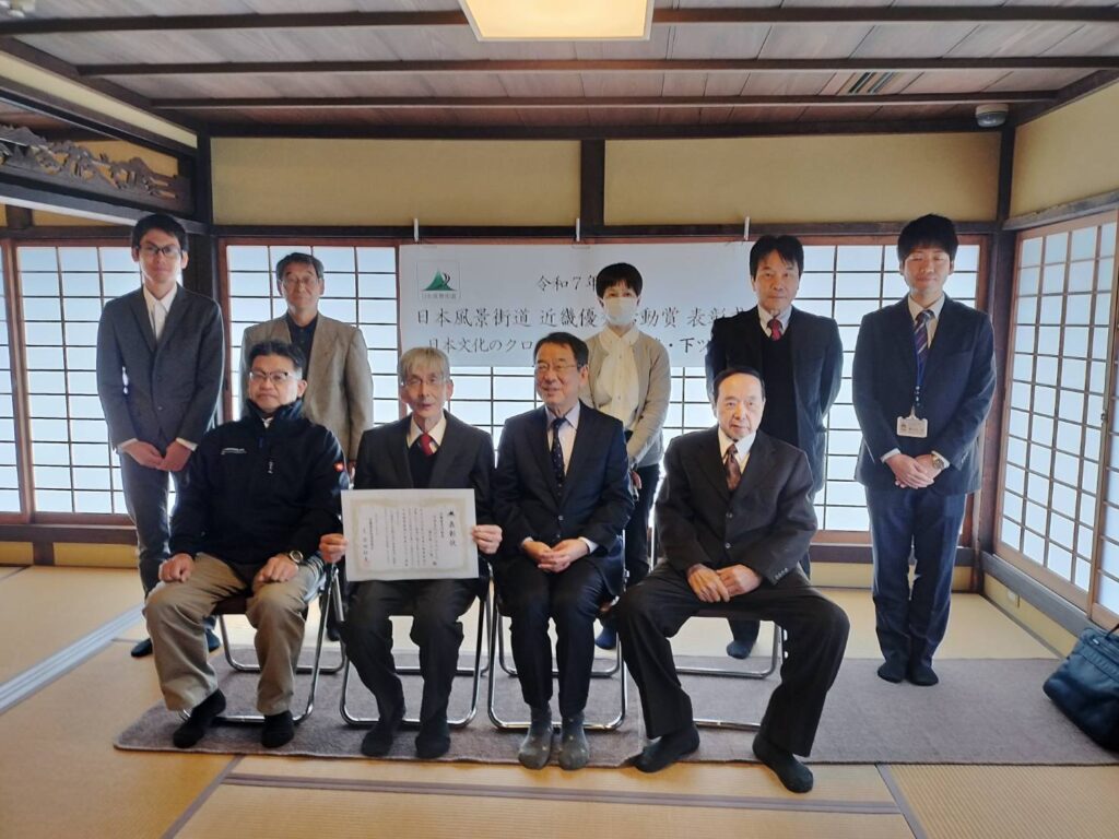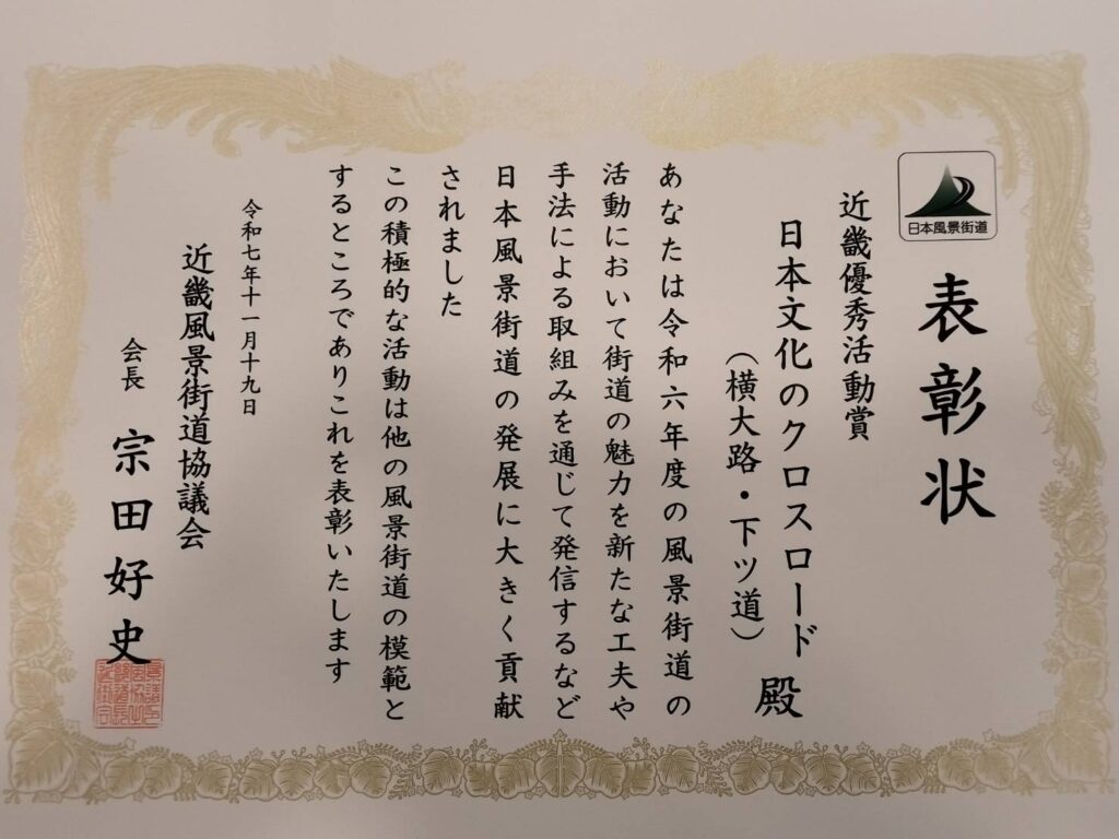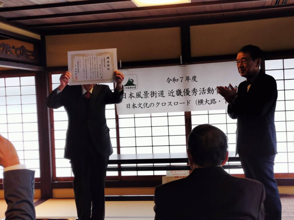 八木の町は「日本文化のクロスロード(横大路・下ツ道)」として登録していただいており、歴史的資源を活かしたまちづくり活動を評価していただき、今回近畿優秀活動賞として表彰していただきました。